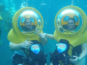 Weise. Mit einer motorisierten, mit Sauerstoff ausgestateten, ein Mann Tauchglocke fahren wir durch das Riff und über
