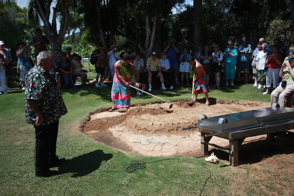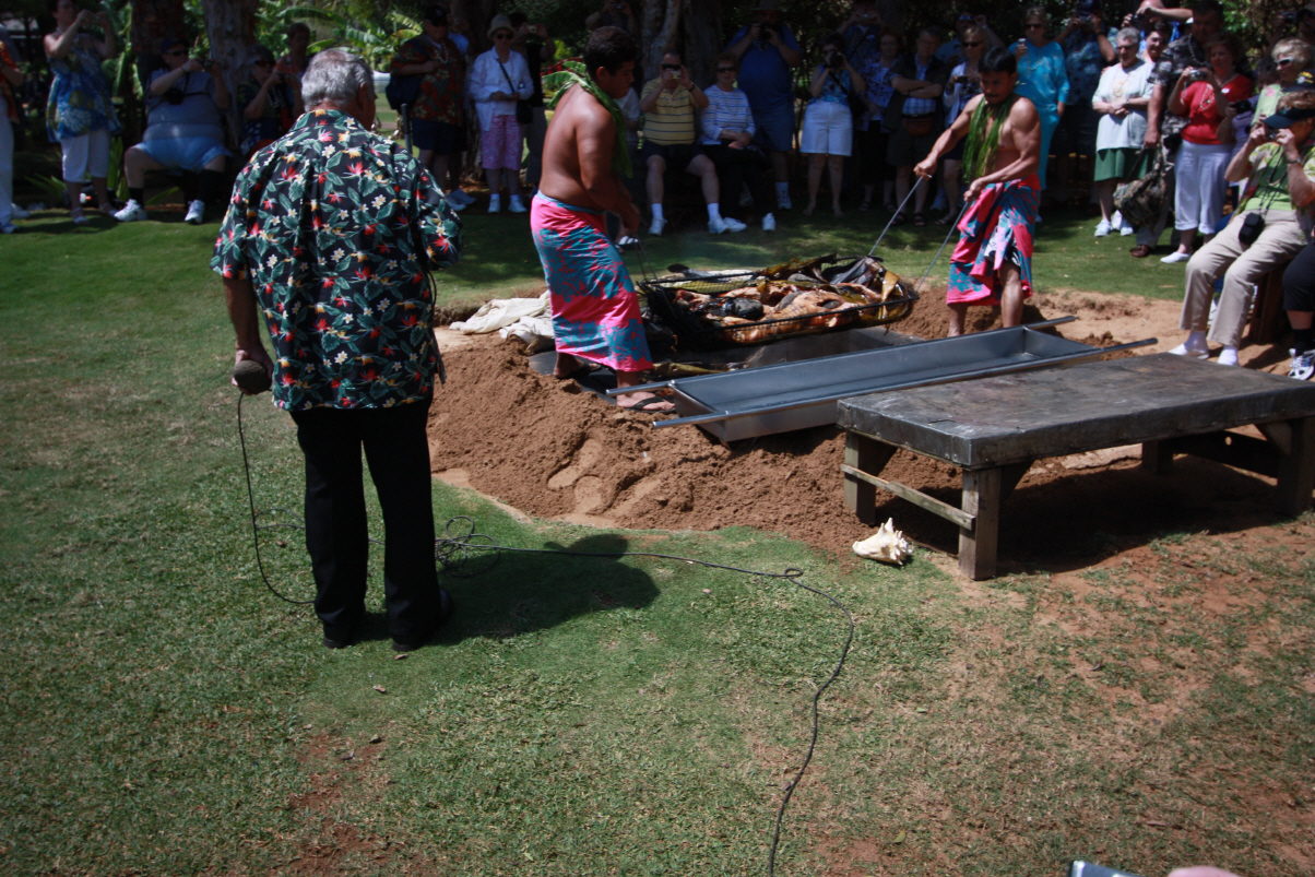 Ein Loch wird ausgegraben darin ein Feuer gemacht auf die Glut kommen Lawasteine und darauf das in Bananenblätter eingepackte ganze Schwein. Dies kocht, zugedeckt mit Erde, einige Stunden.