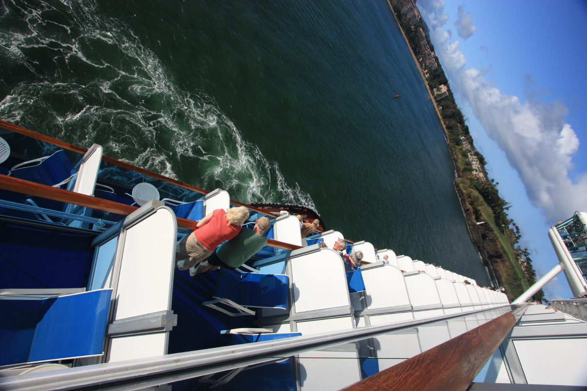 Kein einfaches aus der Bucht raus manövrieren, unsere Crew braucht Hilfe vom Lotsenboot,wenn dass nur gut geht.