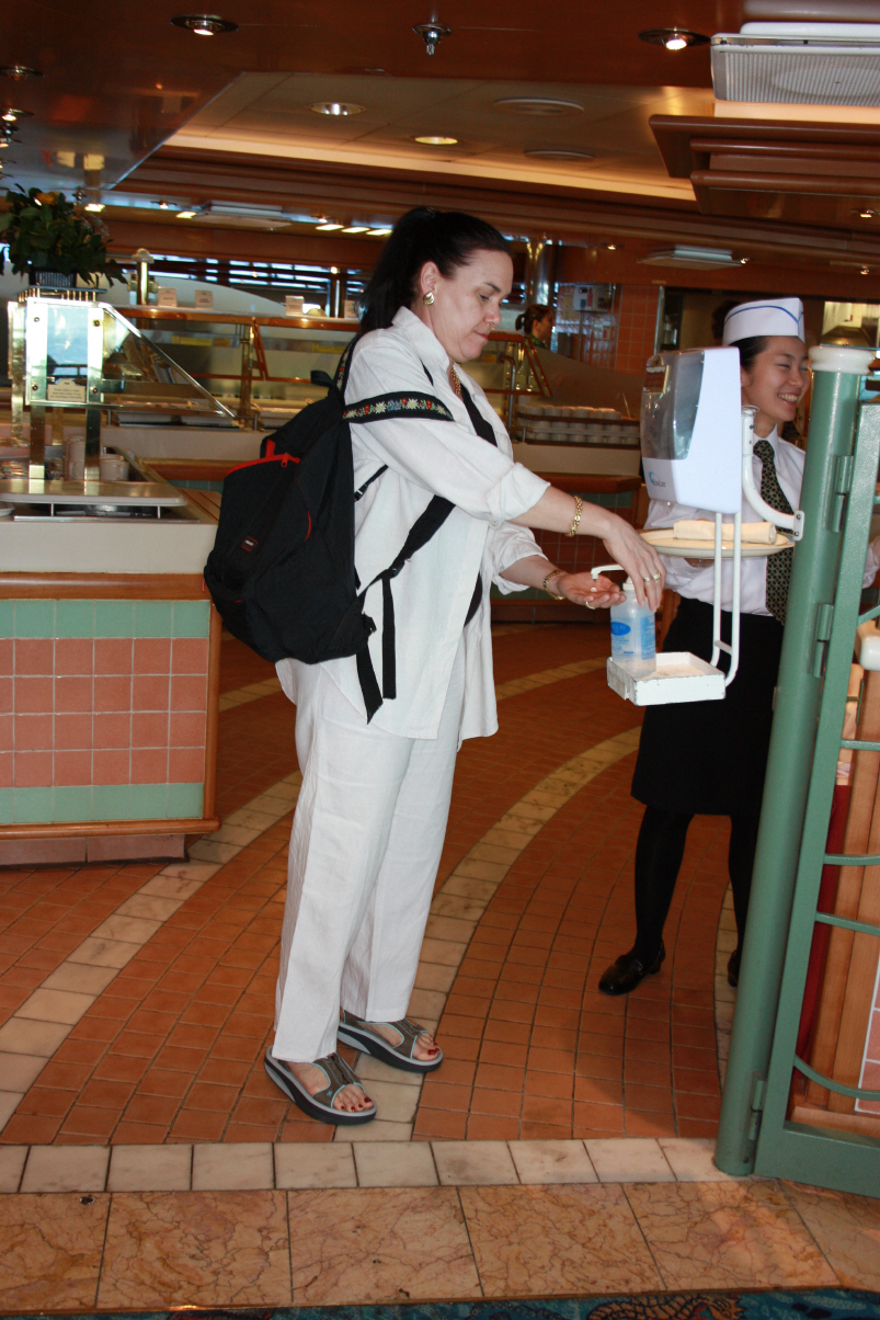 Da auf dem Schiff der berühmte NEROVIRUS kommend aus Nordamerika und Europa, nicht die Seekrankheit, einige Passagiere dahin gerafft hat. Wurde vom Captain und dem Schiffsarzt 20 Sek. Händewaschen mit Seife, möglichst oft, sowie desinfizieren der Hände vor jedem Essen angeordnet. Dazu dürfen wir uns bis auf weiteres nicht selber bedienen, ein riesen Aufwand, auch fürs Personal. Nur die eigenen WC benützen, (ja nichts berühren, jeden der hustet oder so ähnlich über board hihhi, mein Kommentar) Keine Angst uns geht es gut sind immun !!!!!!!!